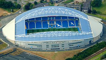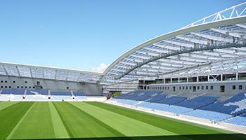 布賴頓社區(qū)球場(chǎng)開放于2011年5月。從開始時(shí)起,該球場(chǎng)的設(shè)計(jì)就留有擴(kuò)建余地,并且早在2011年12月,就制定了擴(kuò)建計(jì)劃。2012年初,布賴頓獲得規(guī)劃許可,并且在2012-13賽季開始之前,新增5,000個(gè)座位,在2013年初,再次增加3000個(gè)座位,這使得該球場(chǎng)的容量增至3.05萬個(gè)座位。該球場(chǎng)的主要特征是宏偉的波浪拱形鋼制頂棚結(jié)構(gòu),該設(shè)計(jì)意在襯托周圍的石灰?guī)r山巒。主看臺(tái)上方的頂棚是半透明的天藍(lán)色,再加上可以反光的銀色墻面覆層,進(jìn)一步強(qiáng)化了自然光線。由于采用最新設(shè)計(jì),頂棚重量僅為101千克/平方米,從而成為這種形式的大跨度頂棚的行業(yè)標(biāo)桿。該球場(chǎng)在設(shè)計(jì)上達(dá)到最高環(huán)保標(biāo)準(zhǔn),獲得BREEAM(英國建筑研究院環(huán)境評(píng)估方法)“非常好”評(píng)級(jí)。這一點(diǎn)的實(shí)現(xiàn)有賴于三點(diǎn):通過減少建筑材料的數(shù)量,盡量減少二氧化碳排放量;優(yōu)化絕緣標(biāo)準(zhǔn);以及盡量減少能源消耗和廢物產(chǎn)生。整個(gè)球場(chǎng)共用去4200噸結(jié)構(gòu)鋼材(2011年數(shù)據(jù))。