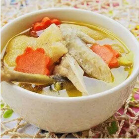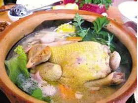 做法:將老母雞放血宰殺,拔毛、去內(nèi)臟,然后洗凈、切成大塊。把生姜洗凈(不要去皮),再拍扁。瓦鍋洗凈,放進(jìn)老母雞、艾梗、生姜;加入清水。先用猛火燒開(kāi),煮約5分鐘后,轉(zhuǎn)換成小火煮,以水面有滾沸為度,約煮1.5~2小時(shí)即可。調(diào)入適量的精鹽即可飲用。