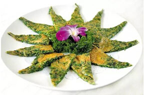 艾葉洗凈后剁碎,加入雞蛋攪勻,加入鹽、胡椒粉,鍋熱加油,煎熟即可。可當(dāng)菜下飯,令人開(kāi)胃。